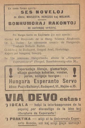 Se Vin interesas Hungarlando, abonu la „Hungaran Esperantisto-n“ (Szeged, Szentháromság-utca 30.)