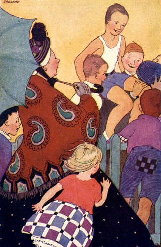Violet's little plan worked. Benny was never too cross to listen to the wonderful stories his sister Violet could tell about Cinnamon Bear. He stood up bravely and marched along, yawning, while his big brother and sister almost swung him between them.