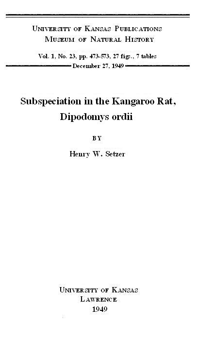The nearest approach to a revision of the genus was Grinnell's (1922) "A Geographical Study of the Kangaroo Rats of California." Since that time, Hall and Dale (1939) revised the D. microps group and Durrant and Setzer (1945) reported upon the kangaroo rats of Utah. The present paper is a review of the species Dipodomys ordii. Some of the objectives in this review have been to learn: (1) What kinds of kangaroo rats are subspecies of the species Dipodomys ordii; (2) the limits of geographic range of this full species; (3) the extremes of color, and of size and shape of the skull [Pg 478] in this one species; (4) the significance of different sizes, shapes and colors; (5) the reasons for the existence, or formation, of selected subspecies; and (6) the relationships of Dipodomys ordii to other species in the genus.