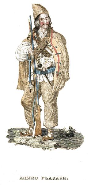 The chief of these Szeressans is styled Haram-Bassa. When fully equipped, he wears a sort of red uniform coat and waistcoat, blue pantaloons, and a sharp-pointed cap of green cloth, turned up with a red and white striped stuff. His arms consist of a musquet, with which he hits his man with never failing certainty at the distance of three hundred paces, a pair of pistols for nearer objects, a Turkish knife and a sword for close quarters; and on busy days there is none of these weapons perhaps but what he employs. In bad weather a wide red mantle with a hood covers both his person and his arms.