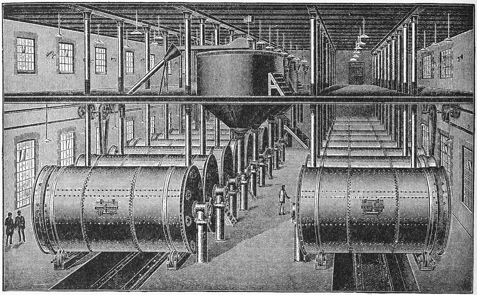 Premature Malting.—Several years ago Galland suggested germinating barley in a drum, his idea being to do away with handling of the grain, and also to be independent of changes of atmospheric temperature. The latest development of this system, the so-called Galland-Henning process of pneumatic malting, has been improved by Mr R. Blair Robertson, and a diagrammatic view of the interior of one of these maltings, showing the drums and conical steeping cisterns, is shown in fig. 9.