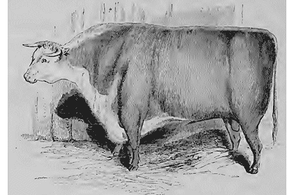 On a prétendu que les descendants des animaux produits par un accouplement entre pioches parents dégénéraient, c'est-à-dire perdaient les qualités distinctives de leur race. Je ne discuterai point cette opinion, mais quant à l'espèce du bœuf en particulier, elle ne me paraît qu'une hypothèse basée sur des observations vicieuses et incomplètes; l'expérience ne l'a jamais confirmée, et elle est en opposition avec un grand nombre de faits positifs. Nous pouvons montrer, par un exemple remarquable, la vérité de cette assertion. Au grand meeting de Derby en 1843, M. W. Barnard, Esq., présenta un taureau dont nous donnons ici le portrait scrupuleusement exact.