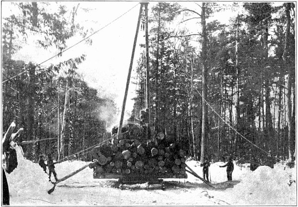 About five hundred camps mar this beautiful region with their rude shacks and temporary16 shelters, some of them being scores of miles from the permanent settlements. During the winter months twenty thousand men labor in the scattered camps of this vast territory, removing the growth of ages that the farms and cities may have comfort and protection. The primeval forest has been invaded, and on the zero air of the north the ring of the ax, the tearing of saws and the strange oaths of the teamsters mingle with the crash of falling trees.