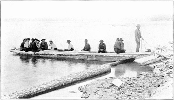 In a bend of the river, below the place where the drivers were working, the large flat-boat called the wannigan, was tied. The wannigan is a floating bunkhouse, cookshed and store combined. In it the men make their home during the drive. The35 supper hour was near when the visitors arrived at Kettle River; the journey had been long, so the disturbing blast of the cookee's horn was a welcome sound. In response to the call the rivermen hastily made for shore, and headed for the grassy place near the wannigan. The example of the workers was followed by the visitors, who helped themselves to iron knives and forks, tin spoons, cups and dishes. The wet drivers sat around the campfire and ate with a heartiness that comes from a life spent in "God's own open air."