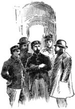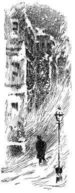As soon as Mr. Broadstreet recovered himself and cleared his eyes from the blinding snow, he saw a heavy, black Shadow on the sidewalk enveloping his own person and resting upon the figure of a man who had evidently just sheltered himself behind the high stone steps, for his footprints leading from the street were still quite fresh. As the man thrashed his arms and stamped vigorously, to start the blood through his benumbed feet, a bright button or two gleamed upon his breast through the cape of his greatcoat. Mr. Broadstreet now recognized him as the policeman whose beat it was, and whom he had occasionally favored with a condescending nod, as he came home late at night from the theater or the club. He had never addressed him by so much as a word, but now the Shadow was full upon him, and Mr. Broadstreet felt that here was his first opportunity.