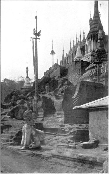 Of Rangoon in those early days, separate mention may be made. One glory it had which still abides. The Shwe Dagôn Pagoda, most sacred and most illustrious of pure Buddhist shrines, dominating the landscape, rose golden to the sky. From far the traveller approaching Rangoon from the sea caught sight of that amazing shaft of gold, and instinctively did reverence. In the bright winter sunshine, in the blue haze of summer heat, in the veiled mysteries of tropic moonlight, it towered awe-inspiring, stupendous, divine. On feast days and sabbaths the platform was thronged with worshippers, surely the brightest, best-humoured, most laughter-loving of all pious crowds. Even now one can imagine no scene more gracious, more mystically serene and lovely, than the pagoda in the light of the full moon, when all that is tawdry and unseemly is charmed away. But thirty years ago, before the platform was covered with modern shrines not all in harmony with æsthetic canons, it was still more gravely and austerely beautiful.