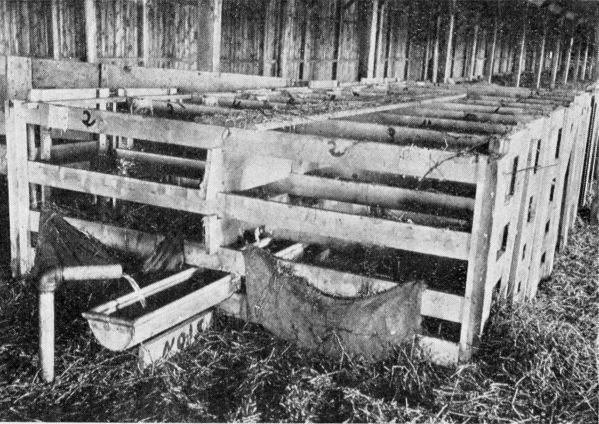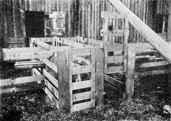 For early or shed lambing the following illustrations will give a good idea of the individual pens, of which there should be about 70 for each 1,000 ewes. These pens are about three and one-half feet long and 32 inches wide. The panels and gates are 3 feet high and are made of 1 by 4-inch boards; the panels being made exactly 7 feet long, and the gates 32 inches wide. At each end on both sides of the panels is nailed a 1 by 2-inch strip to space the 4-inch boards, as follows: Bottom space, 2½ inches; second space, 3 inches; third space, 5 inches; fourth space, 6 inches. To partition the panels at the center, we use 16 or 20-foot boards, as follows: Bottom space, 4-inch board notched ¾ inch on top[Pg 28] and bottom sides, at each cross section of panels; second space, 4-inch board notched ½ inch at each cross section of panels; third space, water trough, 4 inches deep, 8 inches wide; fourth space, 8-inch board notched 1 inch at each cross section of panel. The panel has a 6-inch[Pg 29] board nailed upright at each outer end. This makes the slide for the gate to pass up and down in, also holding it in place. On top of the panel notched in ¾ inch is a 2-inch strip passing parallel with the gates, but over the panels. This strip stops the gates from falling inward. As[Pg 30] there are no nails used in these top strips nor in the boards which make the partition through the center, these pens are easily collapsed and removed, should the shed be used for other purposes during other seasons of the year. To the sides are fastened gunny sacks to hold feed for each ewe. On top at center is an 8-inch walking board, over which the attendants may pass without disturbing dropping ewes in other parts of the shed. To clean the water trough when it becomes dirty there is an endless ¼-inch rope passing through the trough and over the pens; to this are attached rags or gunny sacks, which are drawn through the trough. Tacked to the top board of panel in each pen there is a small canvas sack containing three different colored small rags or flags to indicate whether the ewe claims her lamb, has twins, large udder, or is ready to turn out.