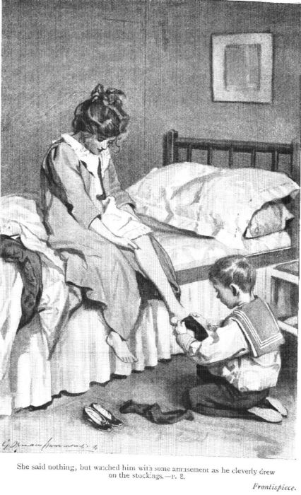 Christabel said nothing. In her heart she was very thankful for this unexpected release from the silly predicament she had got herself into, and deeper down still—for in that wayward little heart of hers there were better things than she allowed herself to be conscious of—she was really touched by her small brother’s kindness. So she said nothing, but watched him with some amusement as he cleverly drew on the stockings—toes first, then heels, sighing a little as he got to the long legs, so that Chrissie at this stage condescended to give a pull or two herself. And at last the task was triumphantly accomplished, and she stood upright and slipped the now clothed toes into the shoes lying in readiness.
