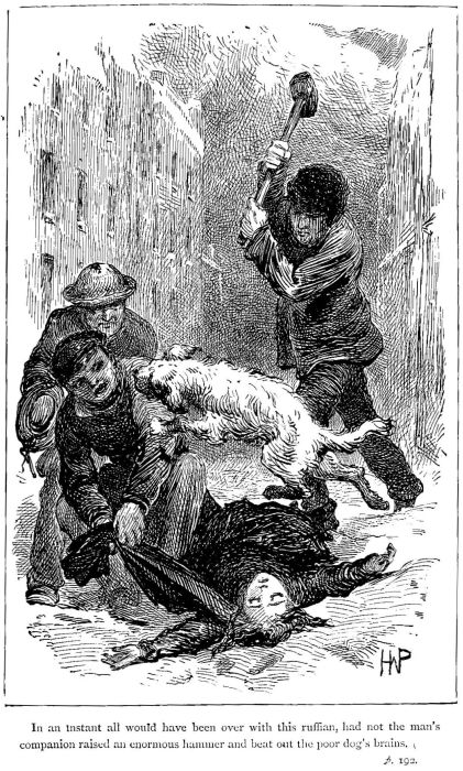 “Scamp shall come ’ome then wid us,” said Jenks, and lifting the little animal in his arms, he and Flo passed quickly through Seven Dials, into Duncan Street, and from thence, through a gap in the pavement, into the deep, black cellar, which was their home.