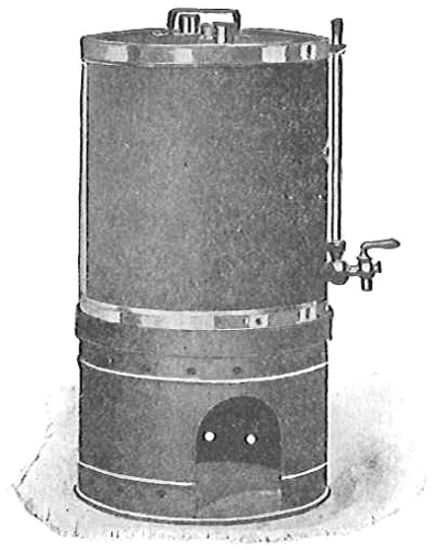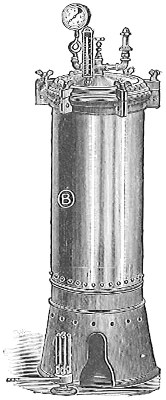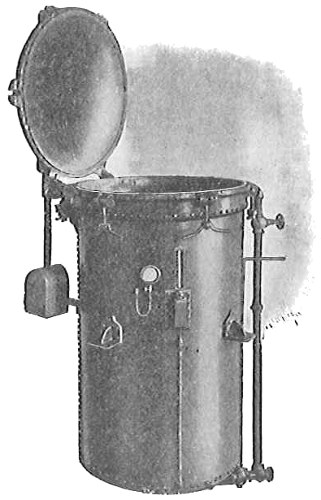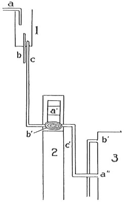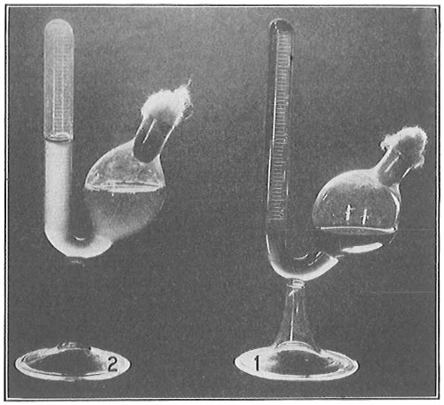 From Spallanzani to Schultze, there were no further experiments to prove or disprove spontaneous generation. Schultze, in 1836, attempted to meet the second objection to Spallanzani’s experiment, i.e., the exclusion of air, by drawing air through his boiled infusions, first causing it to bubble through concentrated sulphuric acid to kill the “germs” (Fig. 3.). His flasks fortunately showed no growths, but his critics claimed that the strong acid changed the properties of the air so that it would not support life. This experiment of Schultze’s, though devised for a different purpose, was really the first experiment in the use of chemical disinfectants, though Thaer (page 31) had used chemicals in a practical way. Schwann, in 1837, modified this experiment, by drawing the air through a tube heated to destroy the living germs (Fig. 4). His experiments were successful but the “spontaneous generation” theorists raised the same objection, i.e., the change in the air by heating. This was the first experiment in which the principle of “dry heat” or “hot air” sterilization was used. Similar arguments were brought forward, also to the use of cotton plugs as filters by Schroeder and Dusch in 1859 (Fig. 5). This was the first use of the principle of sterilization by filtration. It remained for Chevreuil and Pasteur to overcome this objection in 1861 by the use of flasks with long necks drawn out to a point and bent over. These permitted a full access of air by diffusion but kept out living germs, since these cannot fly but are carried mechanically by air currents or fall of their own weight (Fig. 6.). Hoffman, the year before (1860), had made similar experiments but these remained unnoticed. The Pasteur flasks convinced most scientists that “spontaneous generation” has never been observed by man, though some few, notably Dr. Charlton Bastian, of England, vigorously supported the theory from the early seventies until his death in November, 1915.