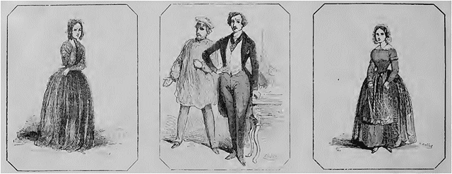 Gavarni, pressentant cette mort prochaine, a voulu sauver quelques traits de ce carnaval bientôt expiré; le carnaval ne mourra pas du moins sans nous laisser un souvenir de sa figure et de sa personne, grâce au spirituel crayon qui vient de le croquer avant son dernier soupir, pour les menus plaisirs des lecteurs de l'Illustration. Sans doute, ce n'est pas là le carnaval tout entier; il serait difficile, cher lecteur, de vous l'envoyer sous bande et à domicile. Essayez un peu de mettre l'Opéra et son bal colossal dans la boîte du porteur de l'Illustration et de le glisser sous votre porte ou sous votre chevet pour vous divertir à votre réveil; je vous en défie, tout habile homme que vous êtes, ô lecteur mon ami! Or, à défaut du carnaval en personne, acceptez-en ces échantillons; d'une part, ce commis marchand déguisé en Albanais pour rire; de l'autre, ce clerc d'huissier affublé des ailes, des pattes, des plumes, du bec d'un oiseau fantastique. Voici un hussard qui certes n'a pas fait ses premières armes dans le régiment des hussards de la mort; son uniforme n'annonce ni de terribles coups de sabre ni de sanglantes batailles; au tuyau de poêle qui lui sert de coiffure, à son dolman orné des glands et des cordons de ses rideaux, on devine que mondit hussard sort de l'école militaire des bals masqués, et qu'il ne connaît que la manœuvre professée de minuit à six heures du matin, sous le commandement du capitaine général Musard; ce n'est certes pas sa sabretache, si semblable à un cabas, qui dira le contraire et convertira mon héros nocturne en César ou en Napoléon.