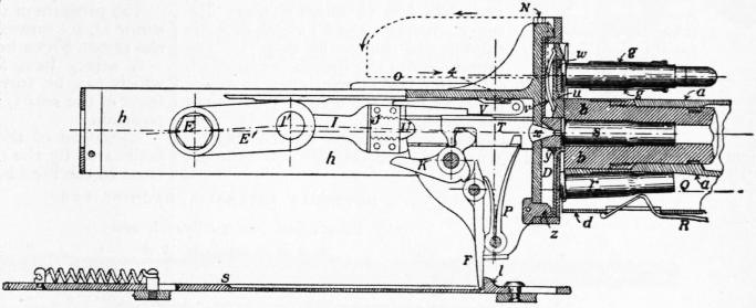 The retracting springs now react and pull the slide forwards; the cam (98) strikes the dog (23), which, as the spring arrangement is of the “non-return” class, does not yield but is depressed, and the front of the carrier and the cartridge on it are therefore raised sharply, and the latter placed in the path of the bolt. The bolt being now pulled forwards, the cartridge is driven off the carrier into the breech, and the bolt locked by the pin (14), causing the bolt to drop in front of the recoil blocks; the carrier is pushed down flat by the advance of the cam lug (98), the trip releases the sear (10), and the projection (96) pushes back the feed lever, completing the action of feeding a fresh cartridge forward. The position shown in fig. 17 is now resumed.