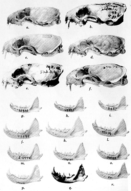The paleontological record fails to show the precise ancestry of Mustela. The genus has been found in deposits of Pleistocene age, but, so far as I can ascertain, not in deposits of earlier times. The Pleistocene remains are not specifically distinct from Recent (living) species, and in only a few instances (see M. f. latirostra and M. e. angustidens) are they even subspecifically distinct from the Recent weasel living in the same area today. It is true that fossil remains from deposits of several stages of the Tertiary beds have in the past been identified in the literature as Mustela, but most of these identifications were made many years ago when the generic name Mustela was used in a far broader and more inclusive sense than it is today and much of the fossil material was so fragmentary that the generic identity could not be ascertained, at least at that time. Because the generic identity could not be ascertained, the fossil material was tentatively assigned to the genus Mustela, the "typical" genus of the family Mustelidae instead of to some other more specialized or less well-known genus of the family. To satisfy my curiosity about these species of "Mustela" of a geological age earlier than the Pleistocene I have personally studied nearly all of the original specimens from North America and have found each to be of some genus other than Mustela. Also, such study as I have been able to make of the Old World fossils themselves that have been referred to the genus Mustela up to 1938, and my study of the illustrations and descriptions of the others from there lead to the same conclusion; that is to say, none that is true Mustela is known up to now from deposits older than the Pleistocene.