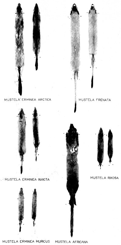 Variation according to the species is evident in the number of caudal vertebrae, but in the other categories of vertebrae no consistent difference in number according to species was found in the material examined. Apparently there is also some geographic variation in the number of caudal vertebrae within a species. For example, the one skeleton seen of Mustela rixosa eskimo (no. 219036, U. S. Nat. Mus., from St. Michaels, Alaska) has only 11 caudal vertebrae, whereas in the 11 Mustela rixosa rixosa from Roseau County, Minnesota, the usual number is 15 with extremes of 14 and 16. Similarly specimens of Mustela frenata from Idaho and California almost always have 1 or 2 more caudal vertebrae than do individuals of the shorter-tailed subspecies of the same species from eastern Kansas.