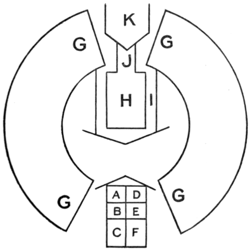 Something of its modern form may be seen from Plate II and from the plans on pp. 10-13. The actual stage (A) is about 18 feet square. On the boards of the back wall is painted a pine-tree; the other sides are open. A gallery (called hashigakari) leads to the green-room, from which it is separated by a curtain which is raised to admit the actor when he makes his entry. The audience sit either on two or three sides of the stage. The chorus, generally in two rows, sit (or rather squat) in the recess (O). The musicians sit in the recess (J) at the back of the stage, the stick-drum nearest the “gallery,” then the two hand-drums and the flute. A railing runs round the musician’s recess, as also along the gallery. To the latter railing are attached three real pine-branches, marked S in the plan. They will be seen in Plate II. The stage is covered by a roof of its own, imitating in form the roof of a Shintō temple.