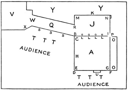 Something of its modern form may be seen from Plate II and from the plans on pp. 10-13. The actual stage (A) is about 18 feet square. On the boards of the back wall is painted a pine-tree; the other sides are open. A gallery (called hashigakari) leads to the green-room, from which it is separated by a curtain which is raised to admit the actor when he makes his entry. The audience sit either on two or three sides of the stage. The chorus, generally in two rows, sit (or rather squat) in the recess (O). The musicians sit in the recess (J) at the back of the stage, the stick-drum nearest the “gallery,” then the two hand-drums and the flute. A railing runs round the musician’s recess, as also along the gallery. To the latter railing are attached three real pine-branches, marked S in the plan. They will be seen in Plate II. The stage is covered by a roof of its own, imitating in form the roof of a Shintō temple.