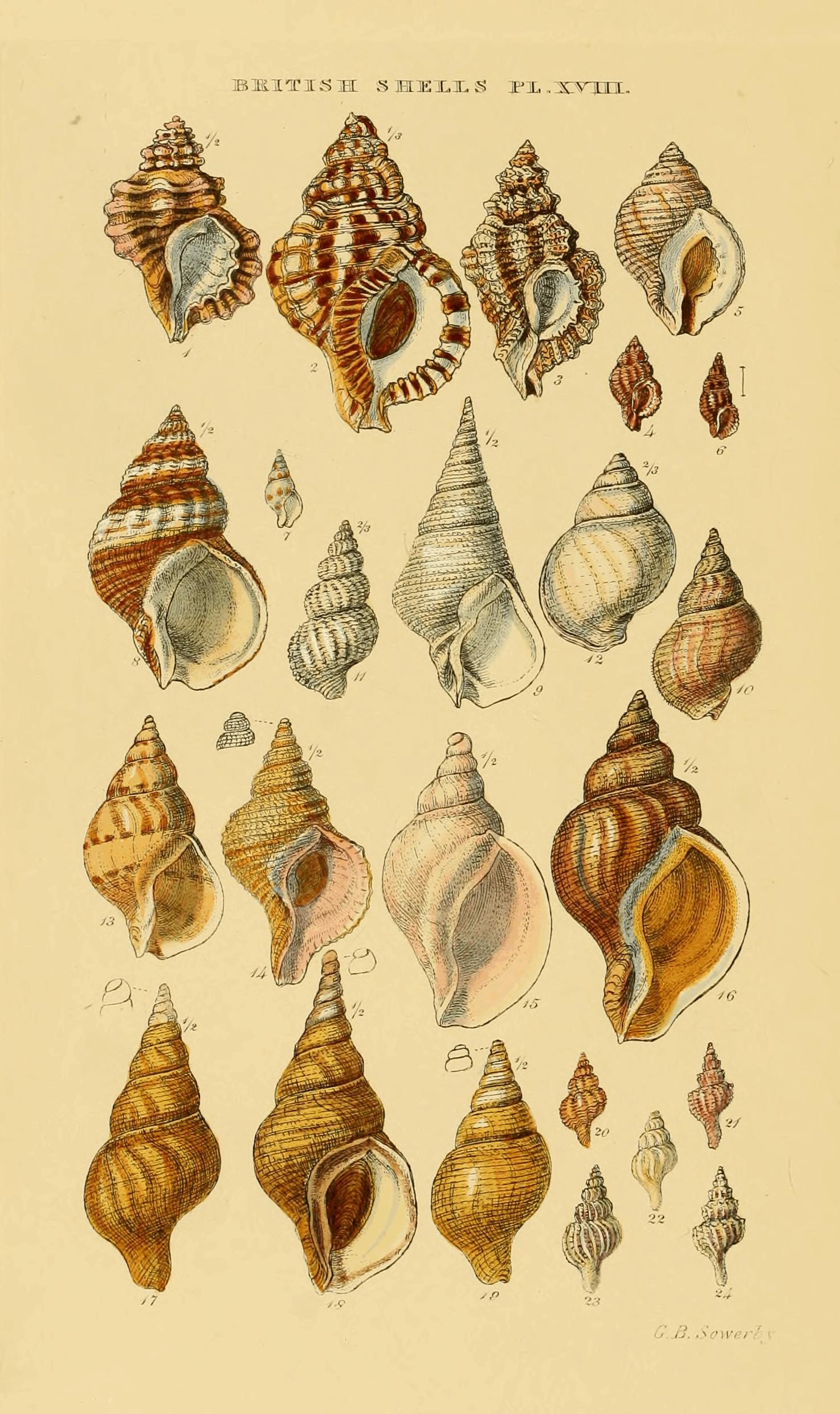 Pl. XVIII. Purpura 5. Buccinum 10? Fusus 15, as Trophon, 16, as Tr., 17, as Tr. gracile, 18, as Tr. T., 19, as Tr. p. Trophon 22, 24.
