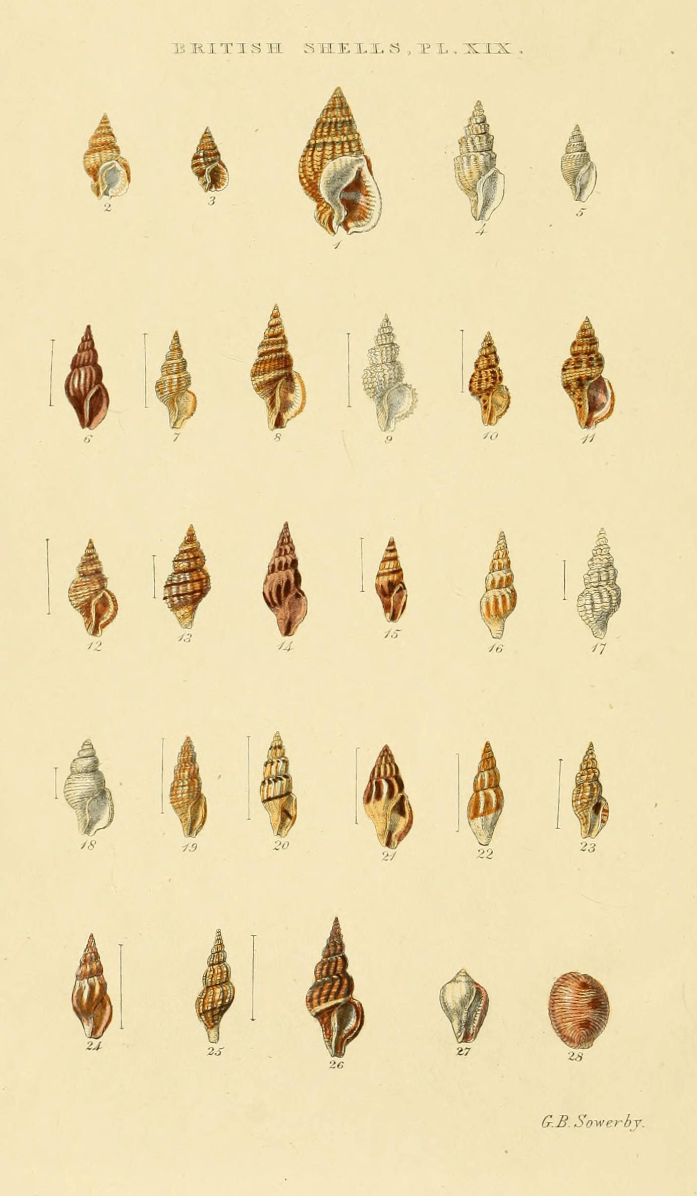 Pl. XIX. Nassa 1, 2. Mangelia, as Clavatula, 4, 5, 8, as Philberti, 9, 11, as Boothii, 12, 14, 15, 17?, 21, 22. Erato 27. Cypræa 28.