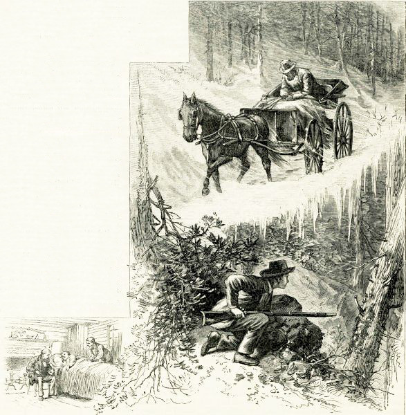 In January, Sam shot two more; but the first week in February, as he was standing on a high and icy rock watching for a big gray fox to leave her den, into which the hounds had tracked her by another entrance, where Pete was stationed, in a moment of careless excitement he leaned too far, slipped, and lay helpless at the foot of the rock, with his left leg doubled under him, just as the old fox darted out, actually brushing his cap as he lay senseless. Peter heard no report of the gun, and hastening to see why Sam had not fired, found that his leg was broken, and he badly bruised all over. Luckily it was not far to the shanty, and Pete, by aid of a long light hand-sled he used to fetch wood on, contrived to get the boy on his own bed, and restored to consciousness, before he went for the Doctor.