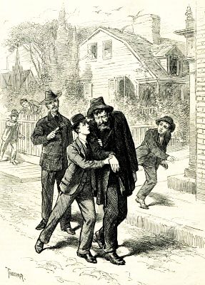 Benny Mallow had just reached home, with his heart away up in the top of his throat, and stuck there so tight that he was sure he could not swallow a mouthful, no matter how nice the dinner might be, when he saw, crossing his street, and at least a quarter of a mile away, three people, one of whom he was sure must be Paul. He shaded his eyes, looked intently for an instant, and then became so certain that it was Paul, whom he felt himself simply dying to see, that he forgot his heart and his dinner, and even the danger that might lurk in any one of a dozen places by the way; he even dropped his stick as he sped away as fast as he could run. By the time he reached the place at which he had seen the men the party was two squares farther to the left, and Benny was panting terribly; but as he now saw that it was indeed Paul whom he had seen, he continued to run.