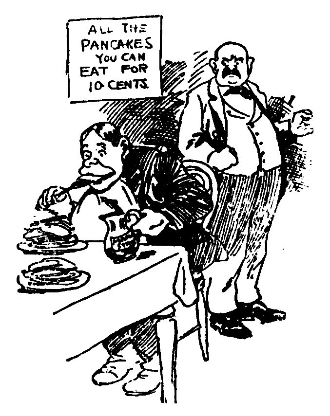 "All the pancakes you can eat for ten cents."