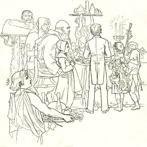 When her boy was two or three years old she carried him to the place where the people of the country met to worship God, where was the great tent called the Tabernacle, with its different coverings, of which we are told in the second book of the Bible, and where the priest of God and those that assisted him lived. Here she left him, with many warm kisses and tears, that he might be taught by these religious men, and be fitted to become in after-years a prophet or teacher of the true God. His school had no vacations; but once a year regularly his mother came to see him, bringing him a new, rich mantle as a gift of love, and a proper robe for one who assisted in public worship, although a child, to wear.