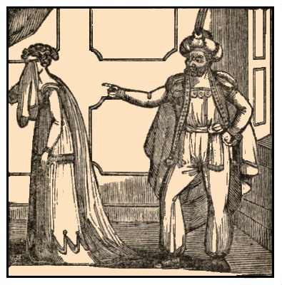 Blue Beard's patience being now exhausted, he burst open the door in a rage, and made a blow at the wretched Fatima, with the intention of striking off her head; but she sprang close to him and evaded it. Furious at being foiled in his aim, he threw her from him, and then seizing her by the hair of the head, was in the act of striking her a blow with his scymetar, when the noise of persons approaching, with hasty steps, arrested the progress of his sanguinary arm. Blue Beard had not time [Pg 27]to conjecture who the intruders might be, when the door opened, and two officers, with their swords drawn, rushed into the apartment.