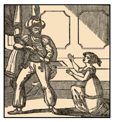 Almost expiring with fear and terror, the trembling Fatima sunk upon her knees, and implored him in the most piteous manner to forgive her. But the cruel Blue Beard, deaf to her intreaties, [Pg 23]drew his dreadful scymetar, and bid her prepare for immediate death.