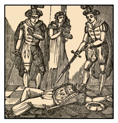 Struck with terror, the guilty wretch released his wife from his grasp, and without attempting to resist, he tried to effect his escape from the resentment of her brothers; but they pursued and seized him before he had got above [Pg 28]twenty paces from the place. After reproaching Blue Beard with his cruelty, they dragged him back to the spot where he intended to have murdered their sister; and there, stabbing him to the heart with their swords, he expired, uttering the most horrid oaths and execrations.