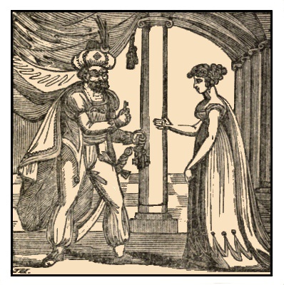 Blue Beard, who guessed what she had been about, requested the keys, in order, as he said, that he might change his dress. She went to her chamber, and soon returned with the keys, all except the one belonging to the blue closet. He took the keys from her with seeming indifference, and after glancing at them minutely, said, rather sternly, "How is this, Fatima! I do not see the key of the blue closet here! Go and bring it to me instantly."