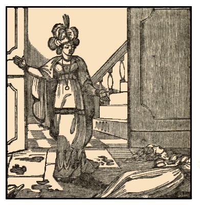 Fatima rose at a late hour next day, and consulted with her sister how she ought to proceed. She thought first of escaping from the castle, but as her brothers were expected in an hour or two, she resolved to wait their arrival. [Pg 20]A loud knock at the gate made her almost leap for joy, and she cried, "they are come! they are come!" but what was her consternation when Blue Beard hastily opened the door, and entered. It was impossible for Fatima to conceal her agitation, although she pretended to be very happy at his sudden and unexpected return.