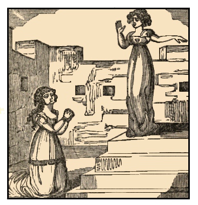 When alone with her sister, Fatima felt her dreadful situation, and again burst into tears. Only fifteen minutes between her and the most cruel death, without the least chance of escape; for Blue Beard had secured the door when he retired, and the staircase they saw only led to the battlements. Fatima's thoughts were now turned to her broth[Pg 24]ers, whom she expected that day; and she requested her sister to ascend to the top of the tower, to see if there was any appearance of them.