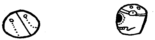 Of these 9, 13 and 17-20 are wholly effaced and 14 for the most part. The very first group refers to human sacrifice, for 1 is a head with an axe affixed to it, 2 contains the hand (i) which so often appears as the sign of grasping, especially in representations of the chase; here it has the same superfix as on page 22a, which on pages 4a-10a and 11a, b, appears as prefix. 3 is the {57}head of god H, perhaps given here as a symbol of wounding (serpent god?). I am unable to explain the meaning of the dot between two crosses in front of this head; perhaps the sign denotes the day Kan, which is here arrived at by calculation. We find the same hieroglyph on page 3. Sign 4 signifies the death-god A = Cimi, who appears again in 12.