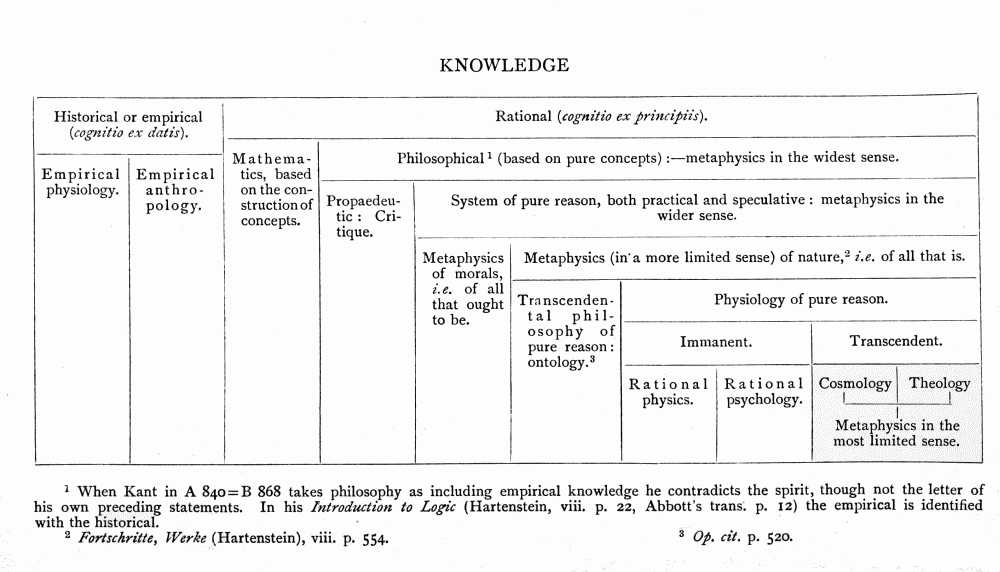 [1746] When Kant in A 840 = B 868 takes philosophy as including empirical knowledge he contradicts the spirit, though not the letter of his own preceding statements. In his Introduction to Logic (Hartenstein, viii. p. 22, Abbott’s trans. p. 12) the empirical is identified with the historical.