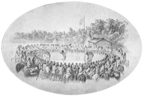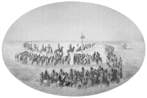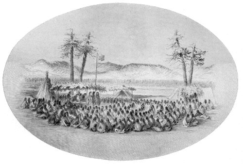 | Twelve thousand Indians kept in hand for months—Nez Perces and Snakes move to Yellowstone for food—Adams and Tappan seek Crows—Delay of boats imperils council—Indians summoned—Council changed to mouth of Judith River—Remarkable express service—Three thousand five hundred Indians assemble—Best feeling—Treaty concluded—Peace established—Terms well kept by Blackfeet—Scenes at council ground—Grand chorus of one hundred Germans—Homeric feasts—Disgruntled commissioner | 107 |