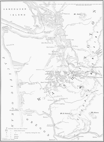 | Country utterly prostrated—Settlers take refuge in towns—Abandon farms—General Wool disbands volunteers, takes the defensive, and maligns the people—Review of war— Kam-i-ah-kan, leading spirit—Treacherous chiefs, fresh from signing treaties, incite war—Miners massacred—Agent Bolon murdered—Major Haller’s repulse—Settlers driven from Walla Walla—Massacre on White River—Volunteers raised— Lieutenant Slaughter killed—Impenetrable forests and swamps—Cascades afford hidden resorts—Fruitless march of Major Rains to Yakima—Governor Stevens addresses legislature—His measures of relief—Calls out volunteers— Visits lower Sound—Enlists Indian auxiliaries—Settlers return to farms—Build blockhouses—Organization of volunteers | 156 |