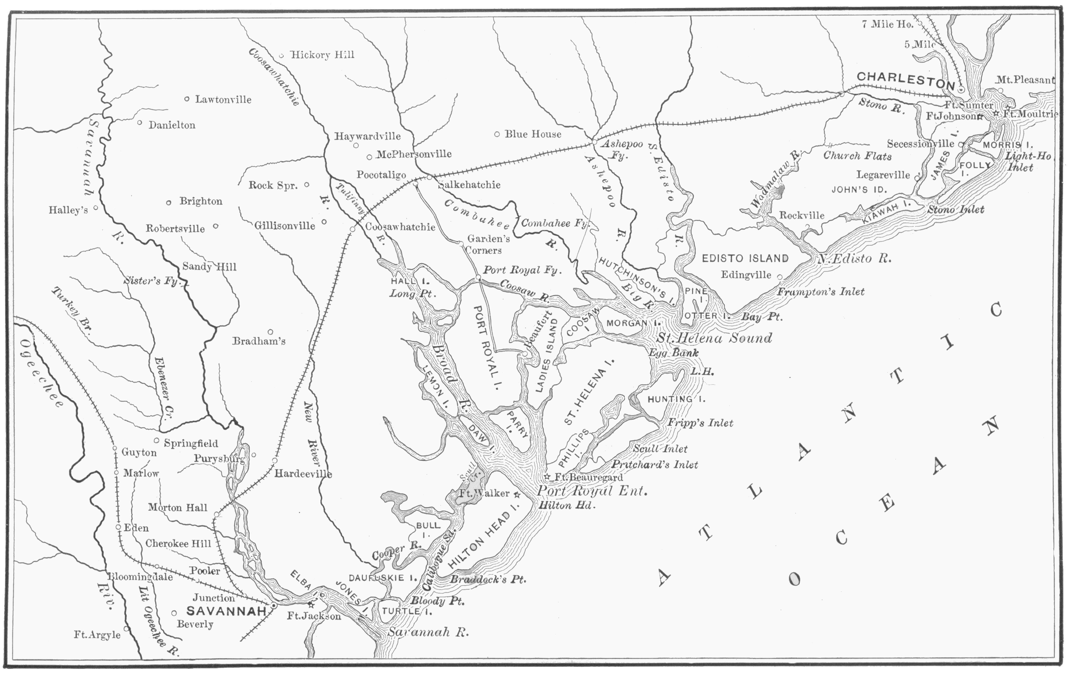 | General Stevens occupies Beaufort, the Newport of the South—Abandoned by white population—Sacked by negroes; their ignorance, habits, condition—Faint attack on the pickets—General Stevens advances across Port Royal Island—Pickets outer side, throwing enemy on the defensive—Enemy close the Coosaw River—General Stevens’s plan to dislodge them authorized—Reinforcement by two regiments and gunboats—Flatboats assembled in a hidden creek—Troops embark at midnight, cross Coosaw, and effect landing—March in echelon toward Port Royal Ferry—The action—The enemy’s hasty retreat—The Ferry occupied—The forts destroyed—Troops bivouac for the night—Cross the ferry and march to Beaufort in triumph—Thanked in general orders for the victory of Port Royal Ferry | 353 |