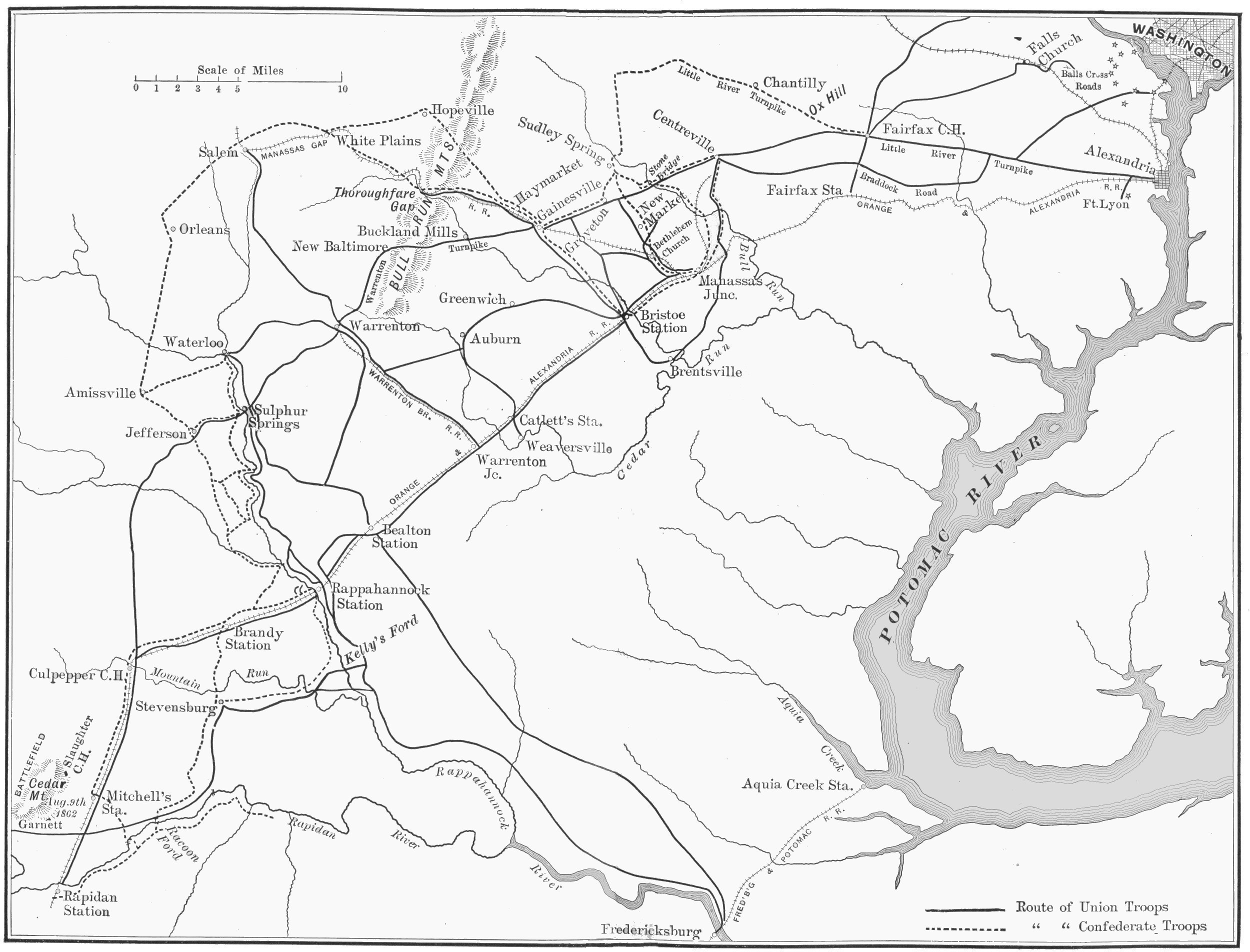 | General Stevens moves to Fredericksburg—Division in three brigades, and joined by two light batteries—Stevens and Reno’s division, march up the Rappahannock; join Pope’s army at Culpeper Court House—General Stevens stops straggling and marauding—Battle of Cedar Mountain—Army of Virginia—Pope advances to Rapidan—General Stevens holds Raccoon Ford—Lee leaves McClellan—Concentrates against Pope, who withdraws behind Rappahannock—General Stevens’s action at Kelly’s Ford—Marching up the river to head off Lee—Benjamin silences enemy’s gun with a single shot—Reinforcements arrive from Army of the Potomac—Jackson marches around right flank and falls on rear—Positions and movements, August 26, 27, 28—Description of Bull Run battlefield—Jackson withdraws from Manassas and takes position there—Movements of Pope’s forces—Fiasco of McDowell and Sigel—Jackson attacks—Stubborn fight of General Gibbon near Groveton—Generals King and Ricketts march away from the enemy—Pope reiterates order to attack | 425 |