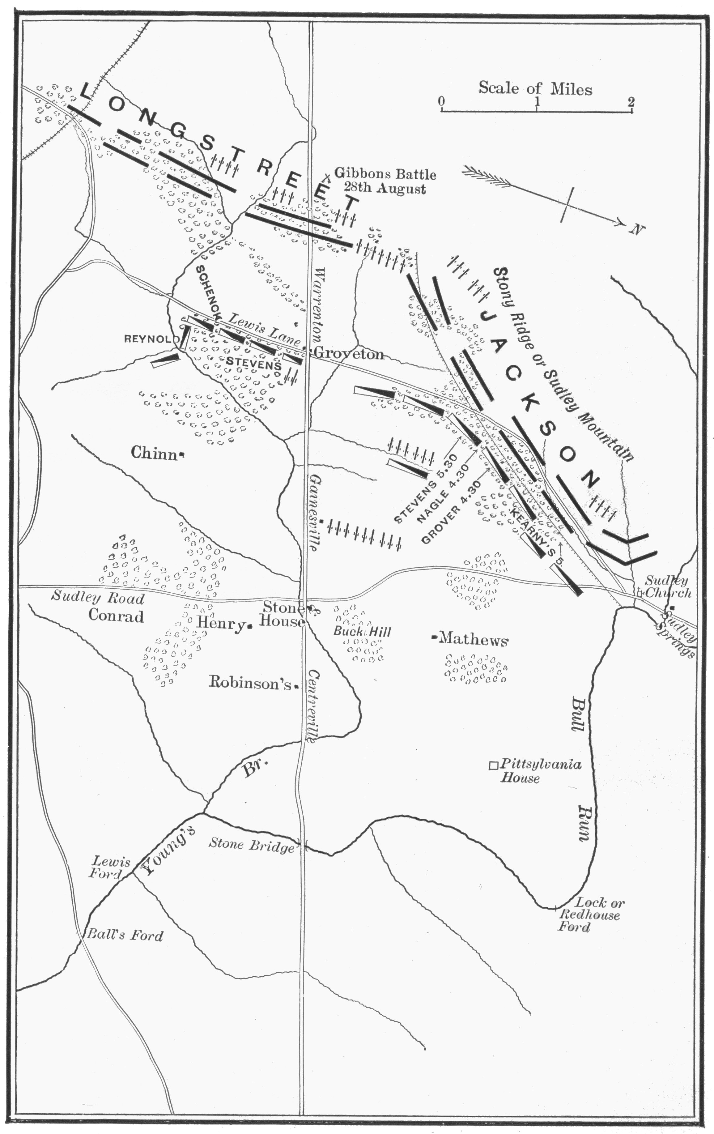 | Jackson resumes his position—Sigel’s troops move forward slowly and become engaged—Reynolds, on left, advances, but falls back—Troops of right wing arrive, scattered to meet Sigel’s cries for reinforcements—General Stevens advances with small force to Groveton—Unexpectedly fired on by enemy’s skirmishers—Benjamin maintains unequal artillery combat—Sigel and Schenck withdraw troops from key-point—Jackson forces back Milroy and Schurz—General Porter’s movement—Inactive all day—Pope hurls disconnected brigades on Jackson’s corps—Attacks by Grover, Reno, Kearny, Stevens, all repulsed—King’s division slaughtered—General Stevens collects his scattered division—Union attacks repulsed the first day—Lee master of the situation—August 30, second day—Pope sure the enemy had retreated—General Stevens expresses contrary view—Captain John More finds enemy in force—Pope’s fatuous Order of pursuit—Porter slowly forms column in centre—Pope’s faulty dispositions— Whole army bunched in centre—Wings stripped of troops— Porter’s attack—General Stevens joins in it—The repulse— Lee’s opportunity—Longstreet’s onslaught—The battle on left and centre—The right firmly held—General Stevens’s remark—Pope orders retreat—General Stevens withdraws deliberately—Checks pursuit—Capture of Lieutenant Heffron—Crosses Bull Run at Lock’s Ford—Bivouac for night—Battle lost by incompetent commander—Troops fought bravely | 446 |