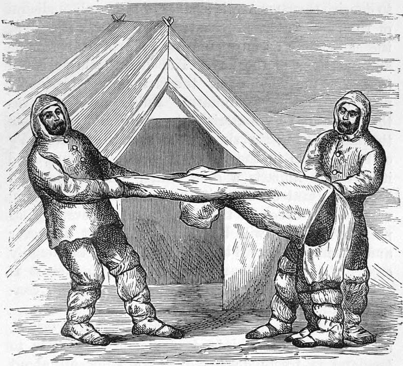 Sledging, first lessons in 58; with dogs, 79, 80, 81, 128; first experiences, 129; severe work, 133; details of, 137; shore-going notions of, 138; realities, 139; lecture on, by Captain Nares, 215; grand palæocrystic chorus, 216; preparations for, during the winter, 230; equipments superintended by Sir Leopold M‘Clintock, 231; weights, 233; auxiliaries and depôts, 234; tents, 235; cooking apparatus, 235; contents of knapsack and storebag, 237; scale of provisions, 237; medical stores, 238 (n.); clothing, 239, 240; programme of sledding, operations, 241; the first encampment, 260; intense cold, 259, 262; arrival at autumn depôt, 263; daily routine, 264 to 270; road-making, 273, 275, 276; increasing difficulties, 304; method of advancing, 295, 304, 306, 313; most northern encampment, 307; extreme northern point, 309 to 311; return journey of northern division begun, 312; northern division reaches land, 321; return of northern division, 327; western division, 331, 332; eastern division, 350. (See Autumn, Hummocks, Temperature, Foot-gear, Cook.)