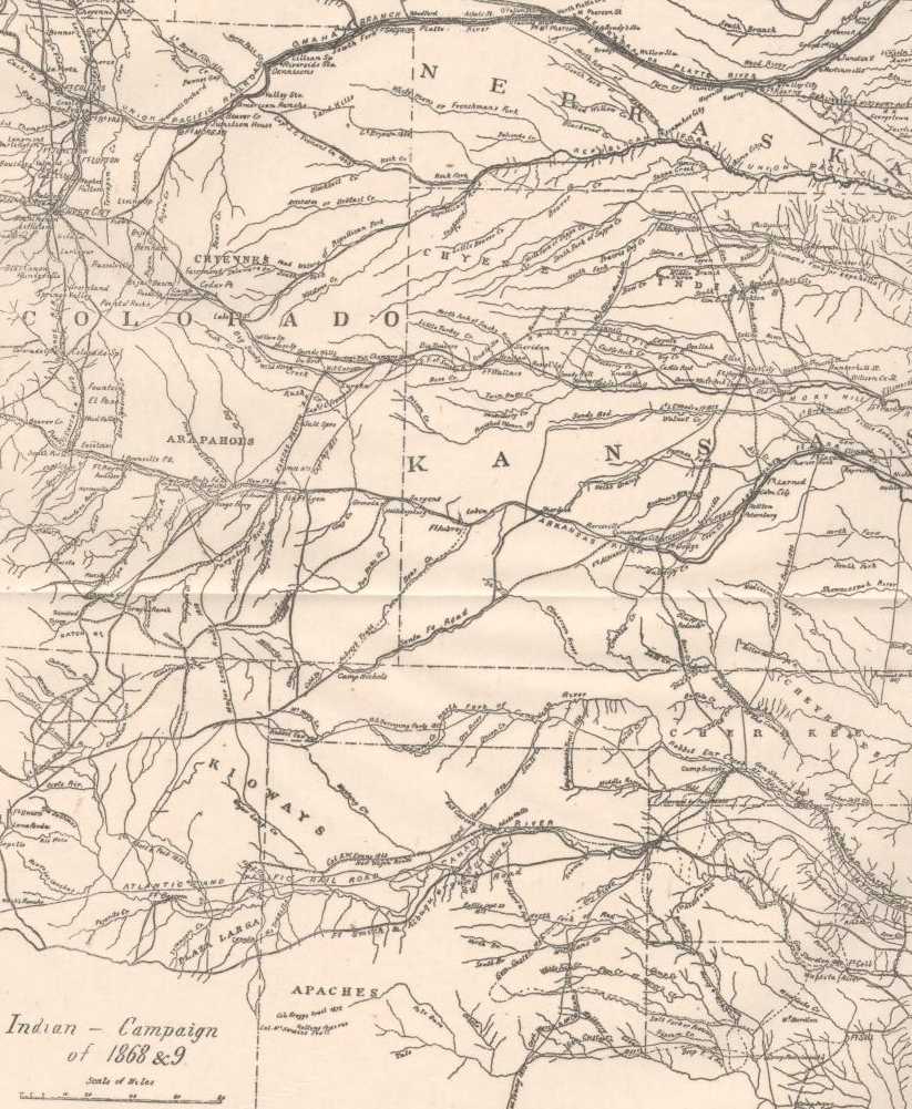 Fort Hays was just beyond the line of the most advanced settlements, and was then the terminus of the Kansas-Pacific railroad. For this reason it could be made a depot of supplies, and was a good point from which to supervise matters in the section of country to be operated in, which district is a part of the Great American Plains, extending south from the Platte River in Nebraska to the Red River in the Indian Territory, and westward from the line of frontier settlements to the foothills of the Rocky Mountains, a vast region embracing an area of about 150,000 square miles. With the exception of a half-dozen military posts and a few stations on the two overland emigrant routes—the Smoky Hill to Denver, and the Arkansas to New Mexico—this country was an unsettled waste known only to the Indians and a few trappers. There were neither roads nor well-marked trails, and the only timber to be found—which generally grew only along the streams—was so scraggy and worthless as hardly to deserve the name. Nor was water by any means plentiful, even though the section is traversed by important streams, the Republican, the Smoky Hill, the Arkansas, the Cimarron, and the Canadian all flowing eastwardly, as do also their tributaries in the main. These feeders are sometimes long and crooked, but as a general thing the volume of water is insignificant except after rain-falls. Then, because of unimpeded drainage, the little streams fill up rapidly with torrents of water, which quickly flows off or sinks into the sand, leaving only an occasional pool without visible inlet or outlet.