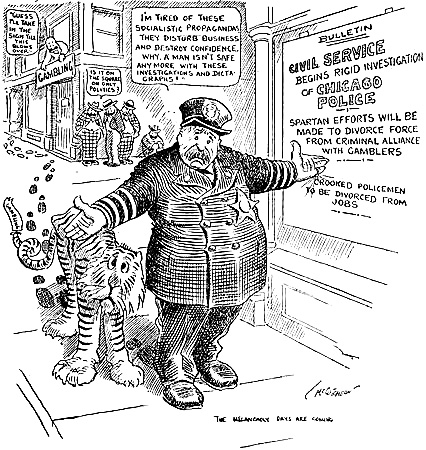 The vice lords have sneaked away to their lairs, and are waiting until the brooms of the municipal house-cleaners are stacked away in a corner.