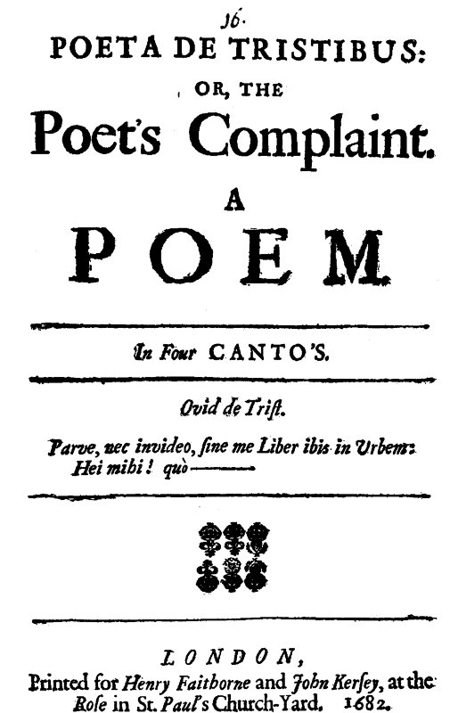 Poeta de Tristibus: or, the Poet's Complaint (PdT) was published by two newly established booksellers, Henry Faithorne and John Kersey, early in November 1681 (title-page dated 1682). The poem is only one of a large number of Restoration satires on writers as a group, its nearest neighbors in time being the pseudo-Rochester "A Session of the Poets," the anonymous "Advice to Apollo," Mulgrave's "An Essay upon Satyr," Otway's The Poet's Complaint, Robert Gould's "To Julian, Secretary to the Muses," the anonymous "Satire on the Poets," Shadwell's The Tory Poets, and Thomas Wood's Juvenalis Redivivus. It differs from these in its Hudibrastic meter, the richness of its biographical detail, and a relatively mild degree of animus against its victims, though there is quite a deal against poetry as art and trade.