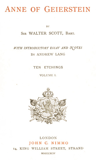 and thus his example has borne, and still bears, new fruit in the most innocent of intellectual pleasures. For a later generation Scott has done what the romances and the epics did for chivalry, and fairy-tales for all the world. In an unexpected place, the Memoirs of Dr. Adam Clarke, we find a tribute to old romance and fairy-tale. Had he not read these in boyhood, the learned and excellent Doctor declares, his religion would have lacked imagination, and his character the courage which he displayed in face of many dangers. Examples of lofty fancy, of chivalrous courage, all that can attract and inspire youth, all that makes against moody despair, and stolid commonplace, and creeping prose, Scott gives, even in this late work, and he enlightens all with humour, as in his admirable description of the despotic German innkeeper, before whom the Earl of Oxford has to lower his bonnet. While youth is youth, and men have yet a smack of it, we can be happy with Arthur Philipson in his duel, with Sigismund in the fight, with the cheery maid of Anne of Geierstein, and her honest ideas of love on first principles, with that royal philosopher King René, with the sagacious loyalty of Oxford, and the manly patriotism of the peasant noble. That the conclusion is entangled, and the knots rather broken than disengaged, is no unusual fault in Scott: it haunted his works from the beginning. Considering his health, his absence, in this tale, from scenes familiar to him, and times familiar to xiv his readers, the novel is remarkable for its interest. What success and merit it possesses are mainly due, however, to a determined effort of the will, not to a delighted and conscious inspiration. In his last essays, though the will was indomitable, the material machinery of the brain was shattered, and we can only criticise them as psychological examples of unconquered courage. He had to see James Ballantyne, broken by his wife's death, and "squandering his thoughts and senses upon dowdy metaphysics, and abstruse theology." It was better for Scott to work on, and die at his task, at the labour of a life which would not be complete, would not offer the same invigorating spectacle, had he thrown his pen away and confessed himself defeated.