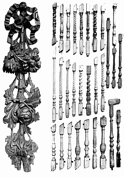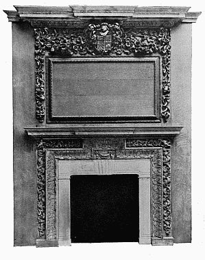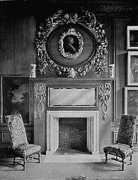 Good specimens of the wood-carving of Grinling Gibbon (born 1648, died 1721) are to be seen at Hampton Court, to which Palace William III. appointed the artist Master Carver. He generally worked in soft woods, such as lime, pear and pine, but sometimes in oak. His subjects were very varied—fruit and foliage, wheat-ears and flowers, cupids and dead game, and even musical instruments—and were fashioned with amazing skill, resource, and ingenuity. He invented that school of English carving which is associated with his name. His fancy is lavish and his finish in this particular work has never been surpassed in this country; but it is doubtful whether his work is not overdone, and as such may not appeal to the purer taste. Often his masses of flowers and foliage too much suggest the unpleasant term which is usually applied to them, viz. "swags." Frequently nothing is left to the imagination in the boldness of his realism. Fig. 1 shows a very happy example of his work over a mantelpiece in one of the smaller rooms in Hampton Court Palace, which is reproduced by the courtesy of the Lord Chamberlain, the copyright being the property of H.M. the King. Upon the shelf are pieces of china belonging to Queen Mary, but the portrait inset is of Queen Caroline, [7] consort of George IV. In the grate is an antique fire-back, and on either side of the fire is a chair of the period of William and Mary.