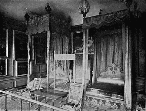 The Court bedsteads (and probably on a smaller scale the bedsteads of the upper classes generally) continued to be at once elaborate and unhygienic, and were fitted with canopies and hangings of velvet and other rich stuffs. King William's bedstead was a great four-poster, hung with crimson velvet and surmounted at each corner with an enormous plume, which was much the same fashion of bedstead as at the beginning of the century. Fig. 2 is an interesting photograph (reproduced by permission of the Lord Chamberlain) of three Royal bedsteads at Hampton Court, viz. those of William, Mary, and George II. The chairs and stools in front are of the period of William and Mary. The table is of later date. Most of the old furniture at Hampton Court, however, has been dispersed amongst the other Royal palaces.