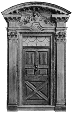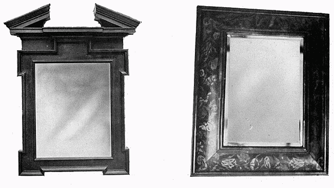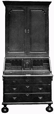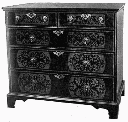 In the first volume of this series we referred to a characteristic of Elizabethan woodwork, viz. inlaying—the laying-in of small pieces of one or several kinds of wood in places cut out of the surface of another kind. In the period under review two further practices are deserving of special notice. The first is veneering, which consists of wholly covering one sort of wood (frequently a common wood, such as deal or pine, but also oak) with a thin layer of choice wood—walnut, mahogany, &c. The object of veneering was not for purposes of deception, as it was not intended to produce the effect that the whole substance was of the finer sort of wood; but by means of applying these thin overlays a greater choice of wood was possible, and a more beautiful effect was produced by the juxtaposition of the various grains.