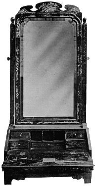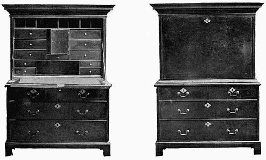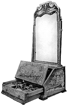 The Queen Anne style has probably been over-praised, a little misunderstood, and possibly a trifle harshly treated. Mr. Ernest Law, whose studies of this period we have already mentioned, describes it as "nothing better than an imitation of the bastard classic of Louis XIV., [9] as distinguished from the so-called 'Queen Anne style' which never had any existence at all except in the brains of modern ęsthetes and china maniacs," and as a case in point refers to Queen Anne's drawing-room at Hampton Court Palace. This verdict is no doubt a true one as regards the schemes of interior decoration, with their sprawling deities and the gaudy and discordant groupings of classical figures of Verrio and his school, to be seen at Hampton Court and other great houses. Verrio, as Macaulay wrote, "covered ceilings and staircases with Gorgons and Muses, Nymphs and Satyrs, Virtues and Vices, Gods quaffing nectar, and laurelled princes riding in triumph"—a decorative scheme which certainly does not err on the side of parsimony. The taste of a Court, however, is by no means a criterion of taste in domestic furniture. There can be no doubt that to this period we are indebted for the introduction of various articles of furniture of great utility and unquestionable taste. The chairs and tables in particular, depending as they do for charm upon simple lines and the transverse grain of the wood, for neatness of design and good workmanship are unsurpassed. Amongst other pieces the bureaux and long-cased clocks made their appearance; also double chests of drawers or tallboys, mirrors for [10] toilet-tables and wall decoration; and washstands came into general use, as well as articles like card-tables, powdering-tables, &c.