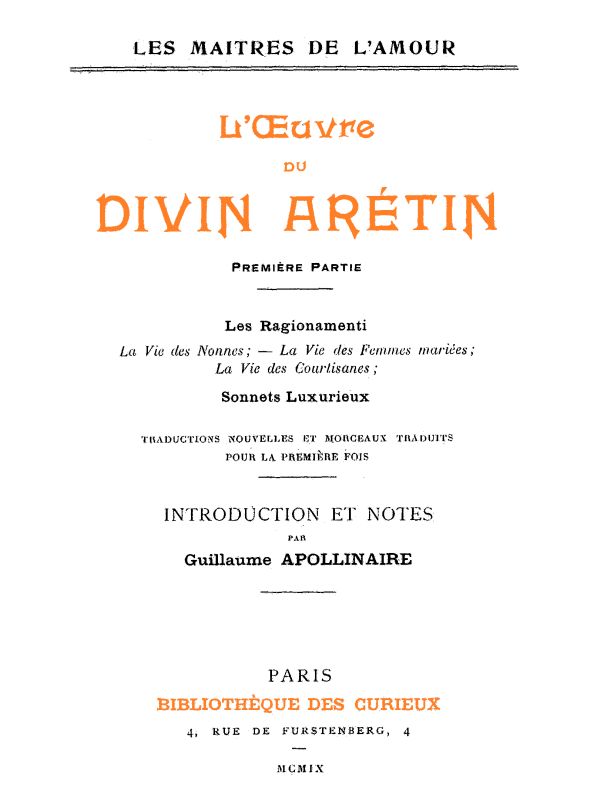 On a pensé que le Divin, dont le nom est populaire en France, y était trop mal connu, et l'on a choisi pour le faire connaître les ouvrages dans lesquels sa personnalité s'est affirmée le plus et qui lui font une place à part parmi les écrivains de tous les temps. On n'a donné ici que les seize Sonnets luxurieux qui paraissent être de l'Arétin. On sait que ces sonnets ont été portés jusqu'à 26, nombre qui ne répond pas à celui des figures de Jules Romain.