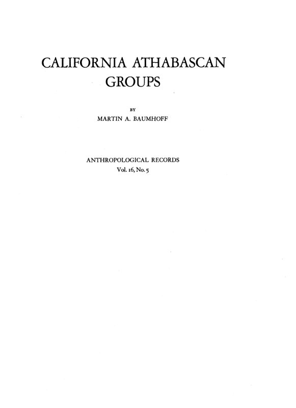 The California Athabascans were selected as the first group for study at the suggestion of A. L. Kroeber, the reason being that the Athabascans have been and still remain one of the least known aboriginal groups in the State. This is not because they were conquered early and their culture dissipated, as is true of the Mission Indians; there were scarcely any whites in the California Athabascan area before the 1850's. Indeed, as late as the 1920's and '30's there were many good Athabascan informants still available. The reason for the hiatus in our knowledge lies in an accident in the history of ethnology rather than in the history of California.